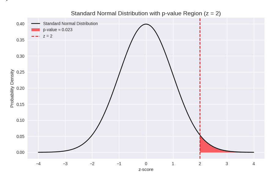 – 빨간색 꼬리 영역: z < -1.96 또는 z > +1.96 → 각각 2.5% 확률, 합쳐서 5% (α=0.05) → 유의수준