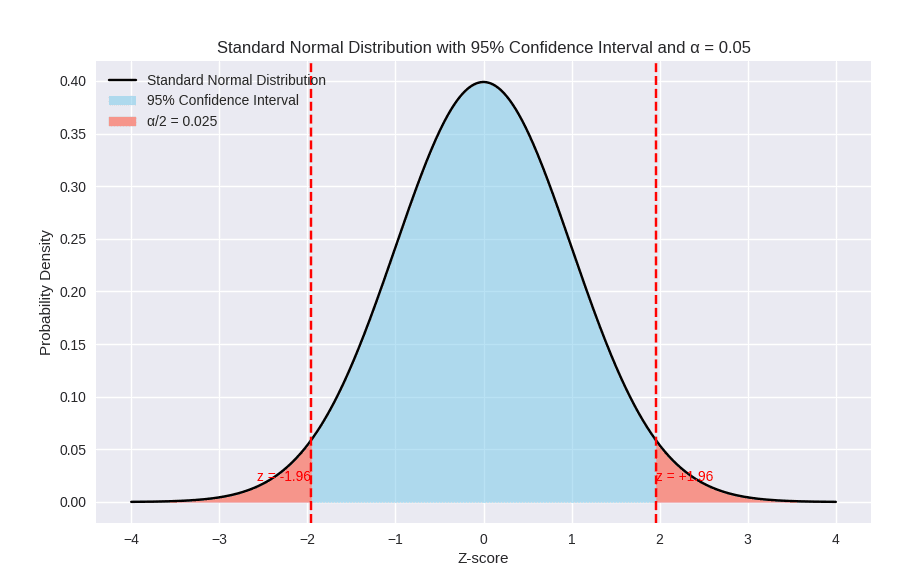 – z=±1.96은 95% 신뢰구간의 경계값이며, 그 바깥쪽 꼬리 영역이 유의수준 α=0.05를 나타냅니다.