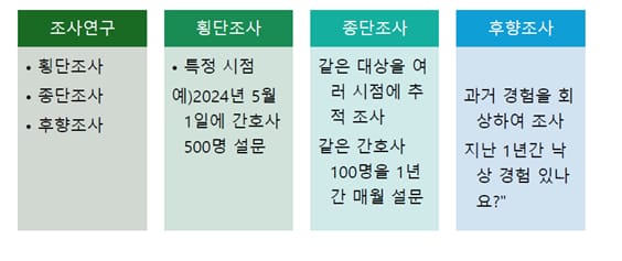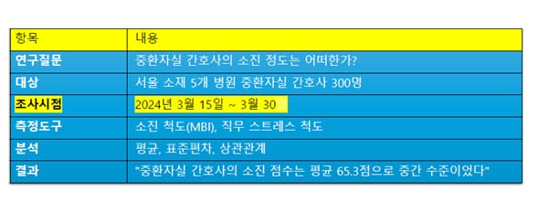 2024년 5월 1일 오후 2시에 간호사 500명에게 스트레스, 직무만족도, 소진을 동시에 설문 조사