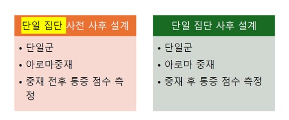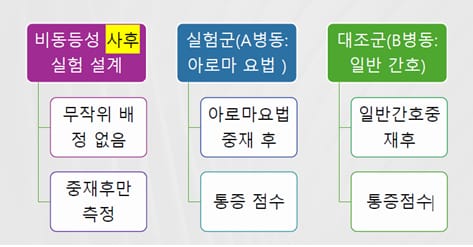 | – 무작위 없음 – A병동, B병동 | 아로마중재 사전통증점수 중재 후 사후 통증점수 | 일반간호 사전 통증점수 중재 후 통증점수 |