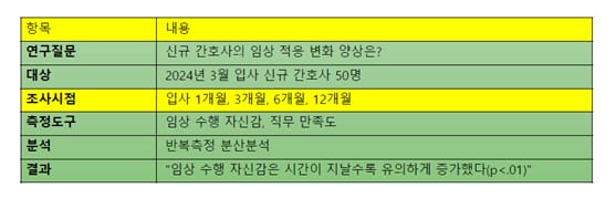 | 현장 연구 | 실험실 아닌 실제 현장에서 | 바쁜 병동에서 그대로 진행 |
