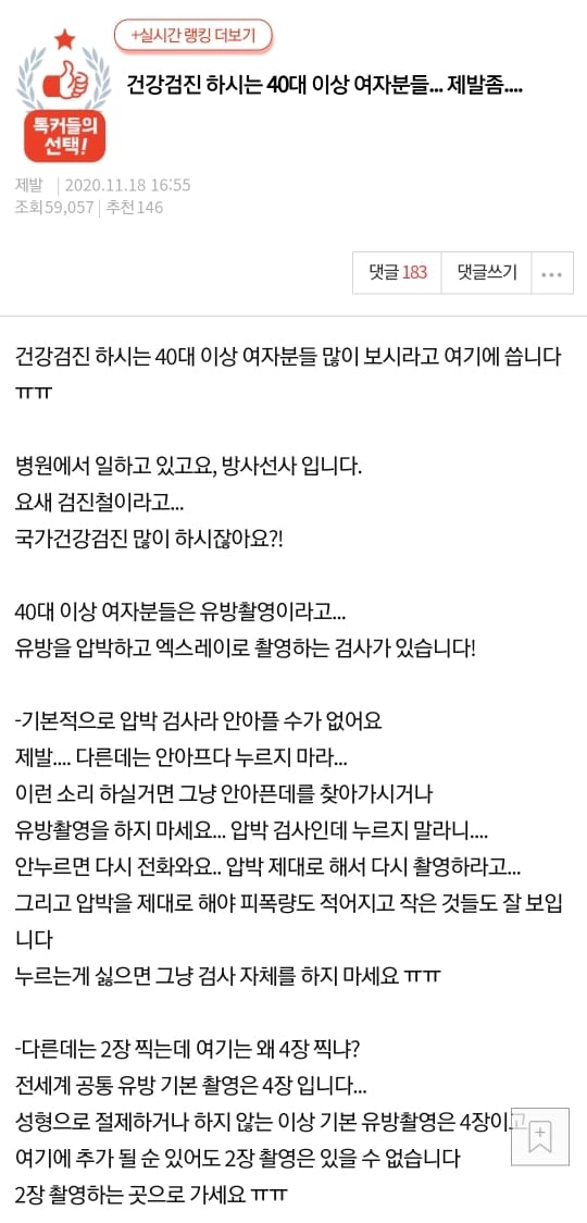 건강검진 하시는 40대 이상 여자분들… 제발좀…. 차례 숨기기 건강검진 하시는 40대 이상 여자분들… 제발좀…. 관련 프로검진러 의사가 알려주는 건강검진 꿀팁건강검진 하시는 40대 이상 여자분들… 제발좀….헌혈 x 두쫀쿠 이벤트 (2026-01-16)(간호관리학) 바로가기 모음(간호관리학) 질관리 분석도구여자가 응급실 가면 임신 사실 묻는 이유 Post Views: 50관련태그:건강검진건강검진 하시는 40대 이상 여자분들건강검진 하시는 40대 이상 여자분들... 제발좀....유방촬영이전헌혈 x 두쫀쿠 이벤트 (2026-01-16)