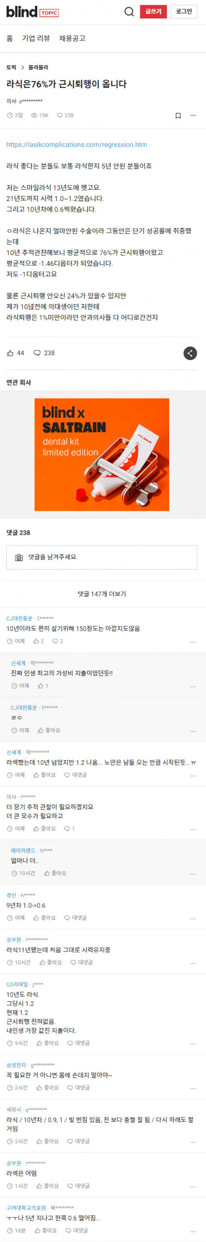 라식은 76%가 근시퇴행이 옵니다 차례 숨기기 라식은 76%가 근시퇴행이 옵니다 관련 (해부학) 감각계통(Sensory system) 01젊은 당뇨병 환자 늘어나고 있음엄지손가락-손바닥 검사 (thumb-palm test) 동맥류 여부 테스트이분척추(Spina Bifida) – 선천성 희귀난치질환(여성건강간호학) 난산 04(여성건강간호학) 난산 03 Post Views: 182관련태그:근시퇴행라식라식은 76%가 근시퇴행이 옵니다이전체지방 1kg 빼는데 걸리는 시간다음16년차 아이돌이 말하는 최고의 다이어트