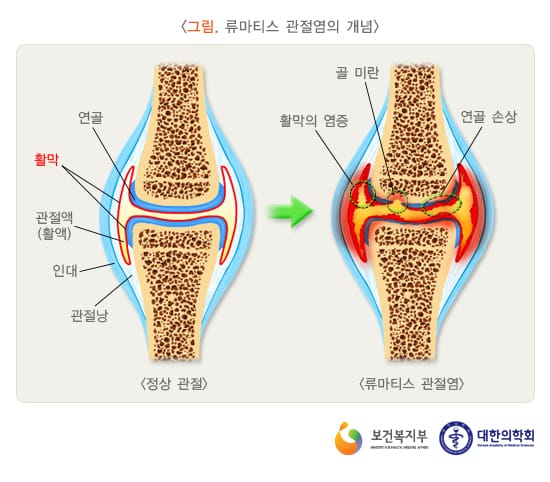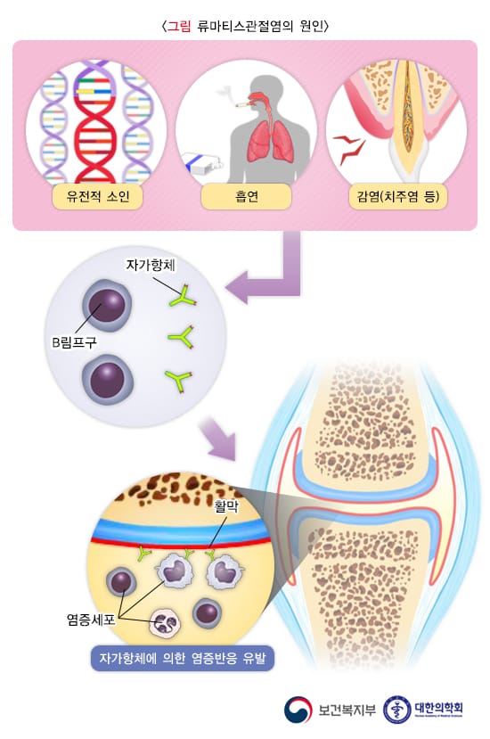 - 자가면역 이상: 면역계가 자신의 활막(synovium)을 항원으로 인식 → 만성 염증 반응.