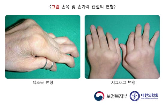 - 대칭성 관절염: 양쪽 손, 발, 손목, 무릎 등 작은 관절부터 시작.