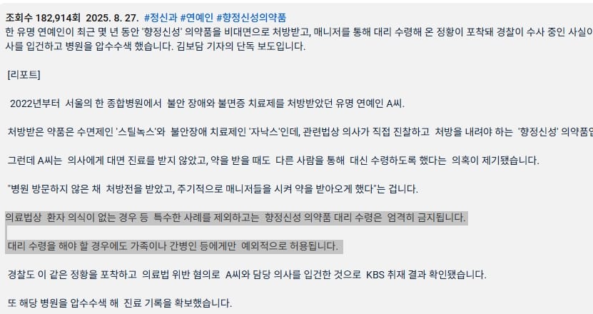 앞서 한 매체는 박나래가 자택에서 먼 거리의 일산 한 오피스텔을 찾아 이른바 ‘주사이모’에게 링거 주사를 맞았다고 보도했다. 해당 매체는 박나래가 사용한 일부 약물이 전문의약품으로 분류돼 처방전 없이는 투약이 불가능하다는 점을 지적했다. 또 ‘주사이모’라 불리는 인물이 2023년 촬영된 MBC ‘나 혼자 산다’ 대만 촬영에도 동행했다고 주장했다.