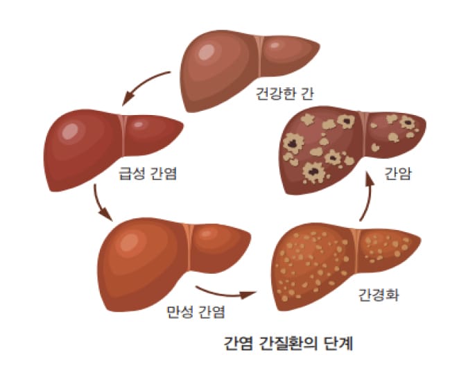 - B형 간염: 간경화증, 간세포암으로 진행 가능