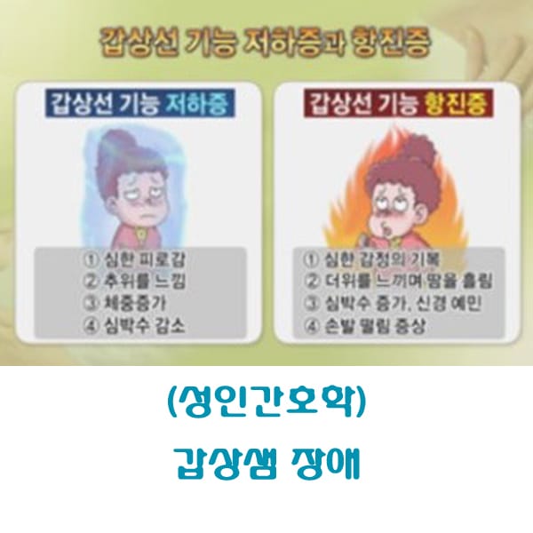 | 아급성 갑상샘염(드퀘르뎅) | 바이러스 감염 | 갑상샘 압통, 일시적 항진증 | 대증요법(진통제, 스테로이드) |