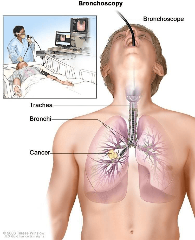 ③ 광학섬유 내시경을 코, 입, 기관내관, 기관절개관 혹은 단단한 기관지경을 통하여 삽입