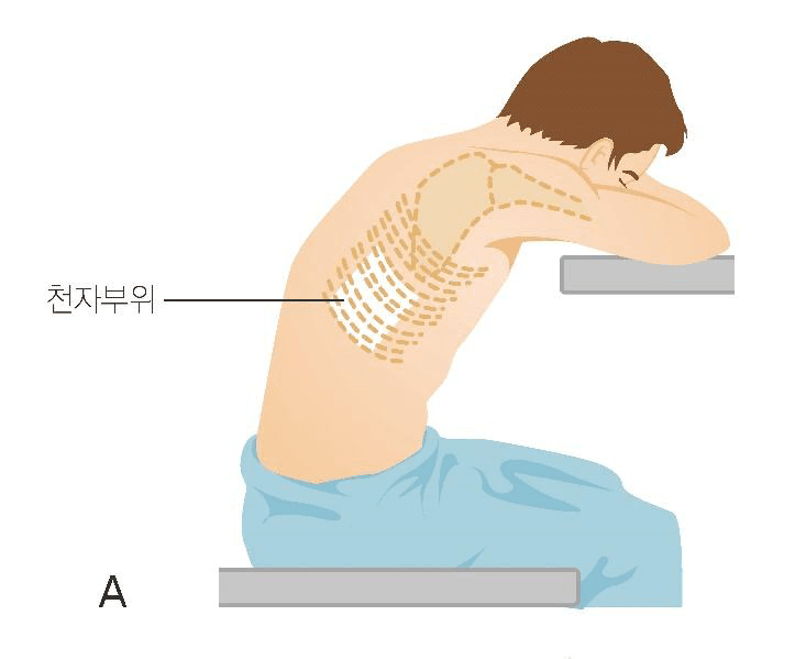– 천자부위를 위로(측위)하여 안정: 폐확장 용이
