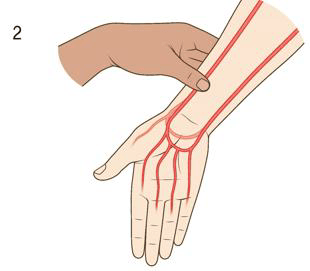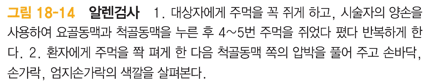 – 요골과 척골의 맥박 막은 후 척골 쪽을 풀었을 때 손색깔 회복으로 사정