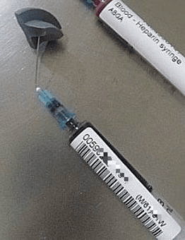 ③ 채취 후 바로 코르크 마개(고무마개)로 막아 공기 차단하고 혈액과 헤파린이 섞여 응고되지 않도록 주사기를 부드럽게 돌림 (흔들지 않도록 주의)