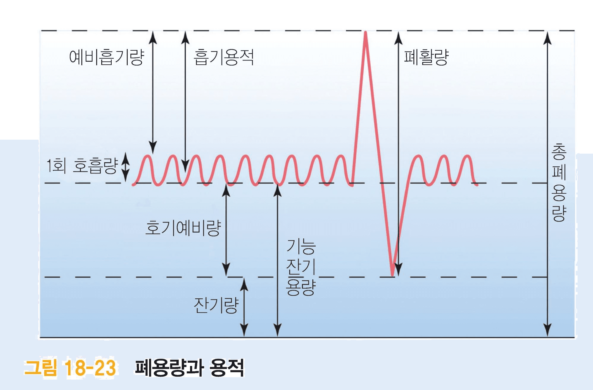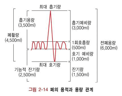 | 일회 호흡량(tidal volume;TV) | 정상 호흡 동안 드나드는 공기 |