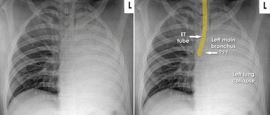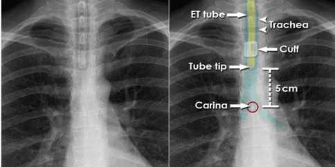위의 영상은 정상적인 ET tube의 위치를 보여주는 사진이다. ET tube는 입을 통해 삽입되고 입에 고정되기 때문에 목이 굴곡, 신전되는 것에 따라 tube가 빠져나올 수도 있고 더 깊이 들어 갈 수 도 있다. 그래서 위의 영상과 같이 목이 신전 또는 굴곡되지 않은 상태에서 ET tube의 끝이 carina로 부터 5~7cm 떨어진 곳에 위치 해야한다.