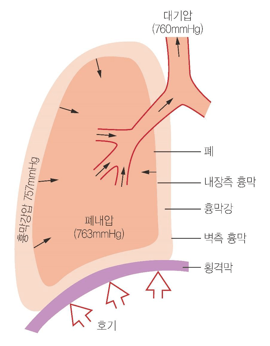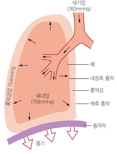 바깥 늑간근 수축하면 늑골 간격이 벌어지고 가슴 위쪽으로 넓어지며,횡격막은 수축하면서 아래로 내려와 팽팽해져 흉곽이 넓어지고 흉강 부피가 커지며 늑막 안의 음압(대기압보다 낮은 상태)이 커지기 때문에 공기가 기도 내로 유입.