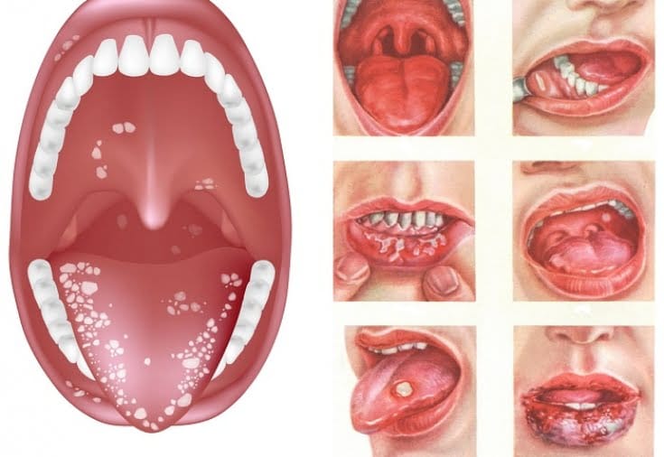 - 구강 내 발적, 궤양, 물집, 흰색 반점