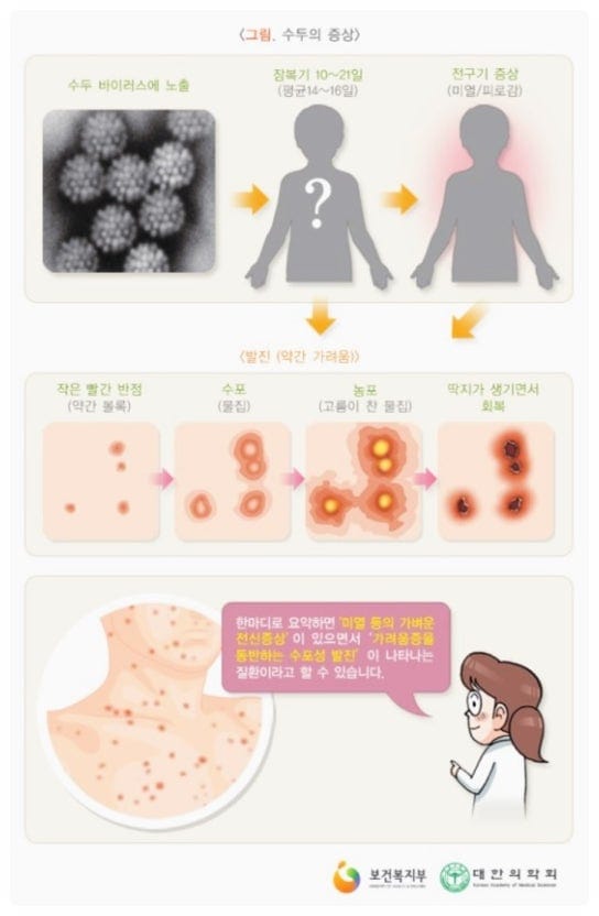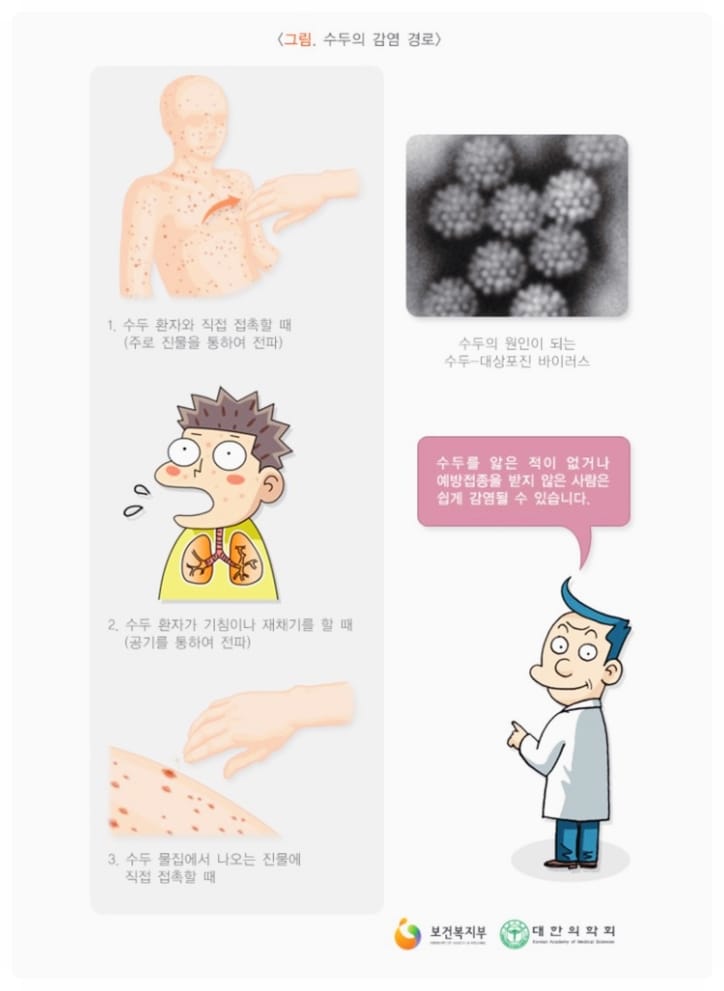 - 전파 경로: 비말(기침·재채기), 접촉(수포액)