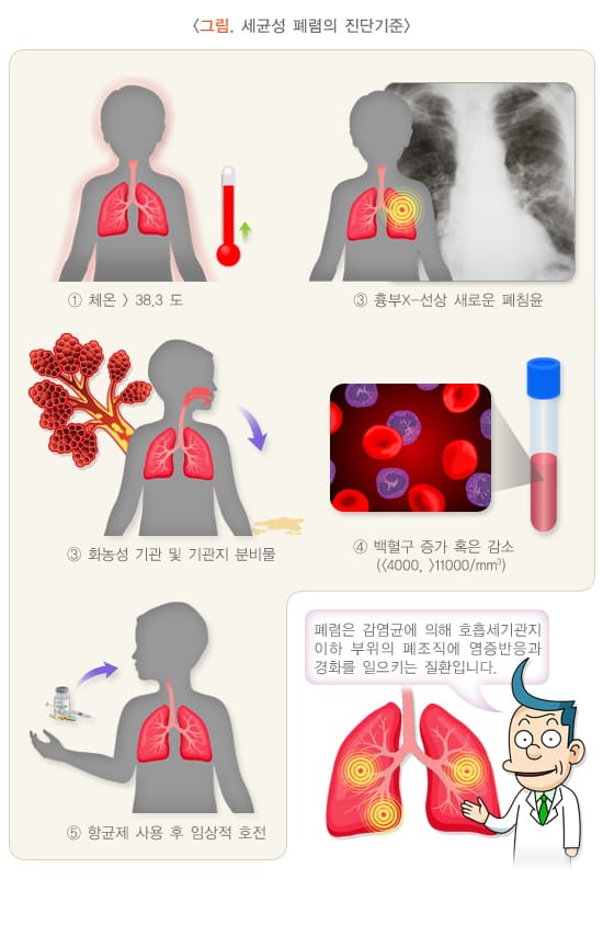 - 객담 검사/혈액 배양: 원인균 확인