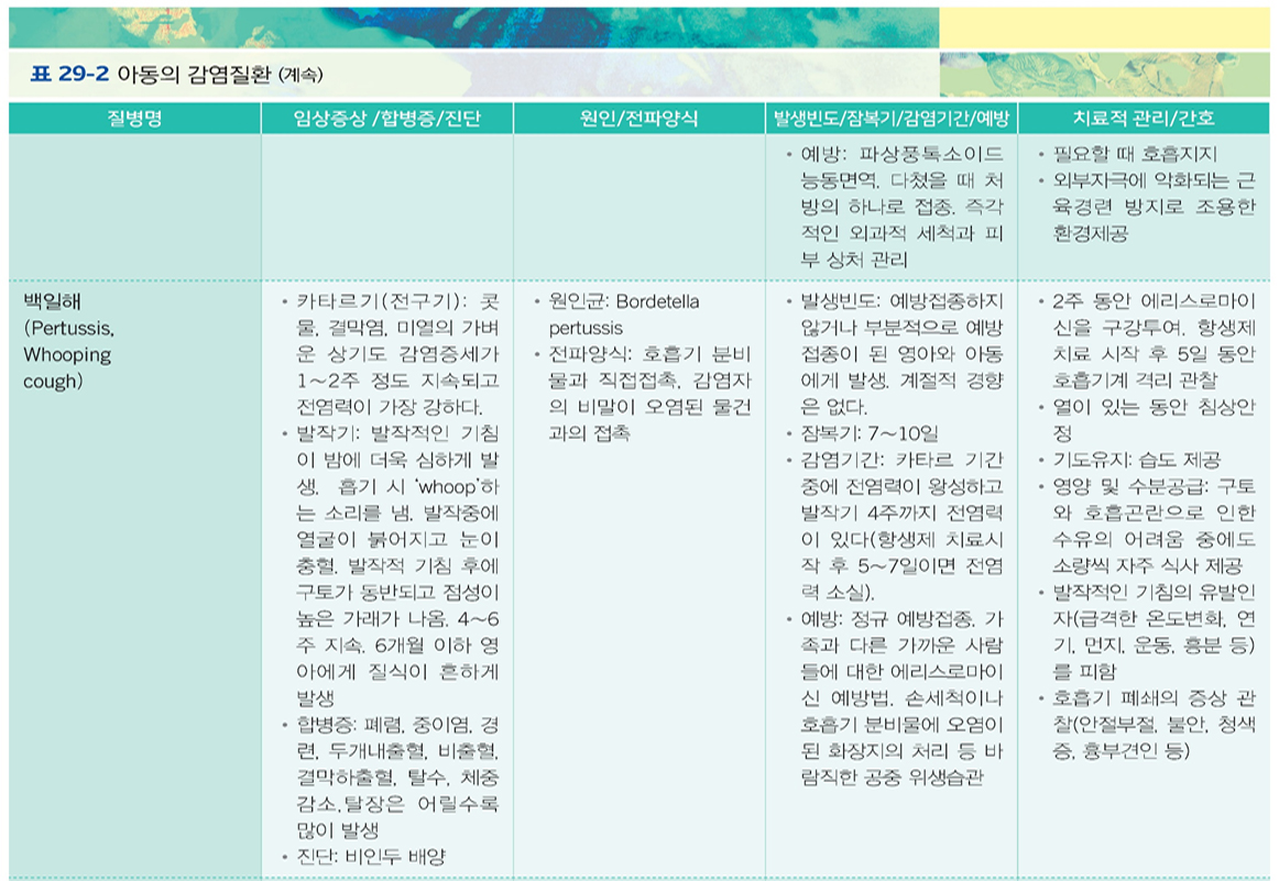 | 백일해 | 세균 | 심한 기침 발작 | ‘흡기 시 소리’ 특징 |