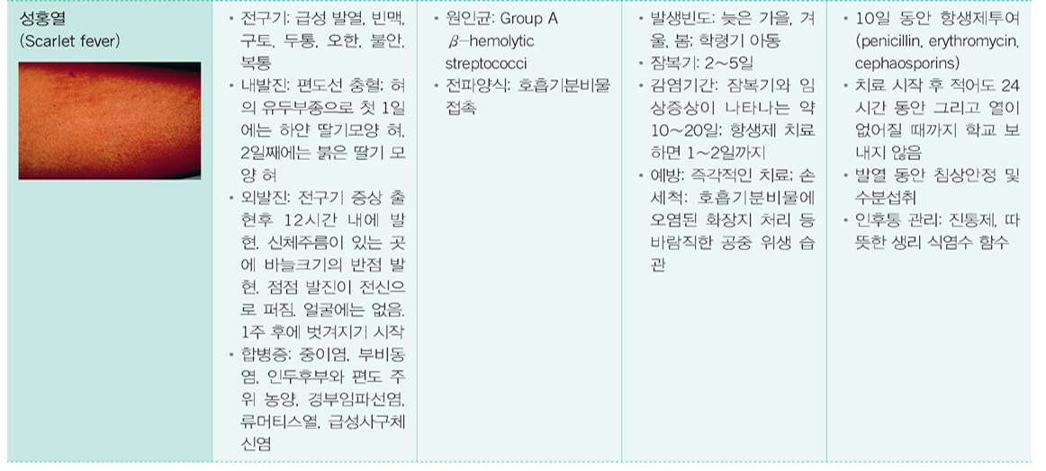 | 성홍열 | 세균 | 발열, 인후통, 발진 | 딸기혀 특징 |