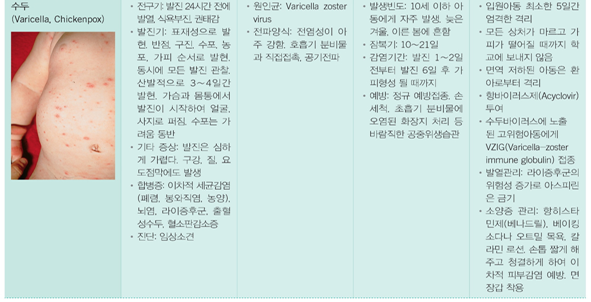 | 수두 | 바이러스 | 가려운 수포성 발진 | 물집 → 딱지로 진행 |