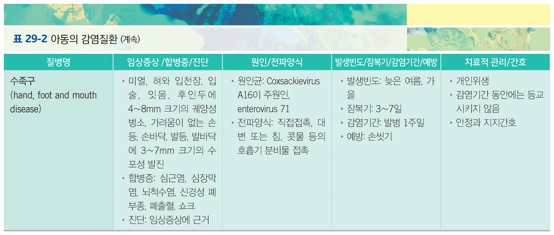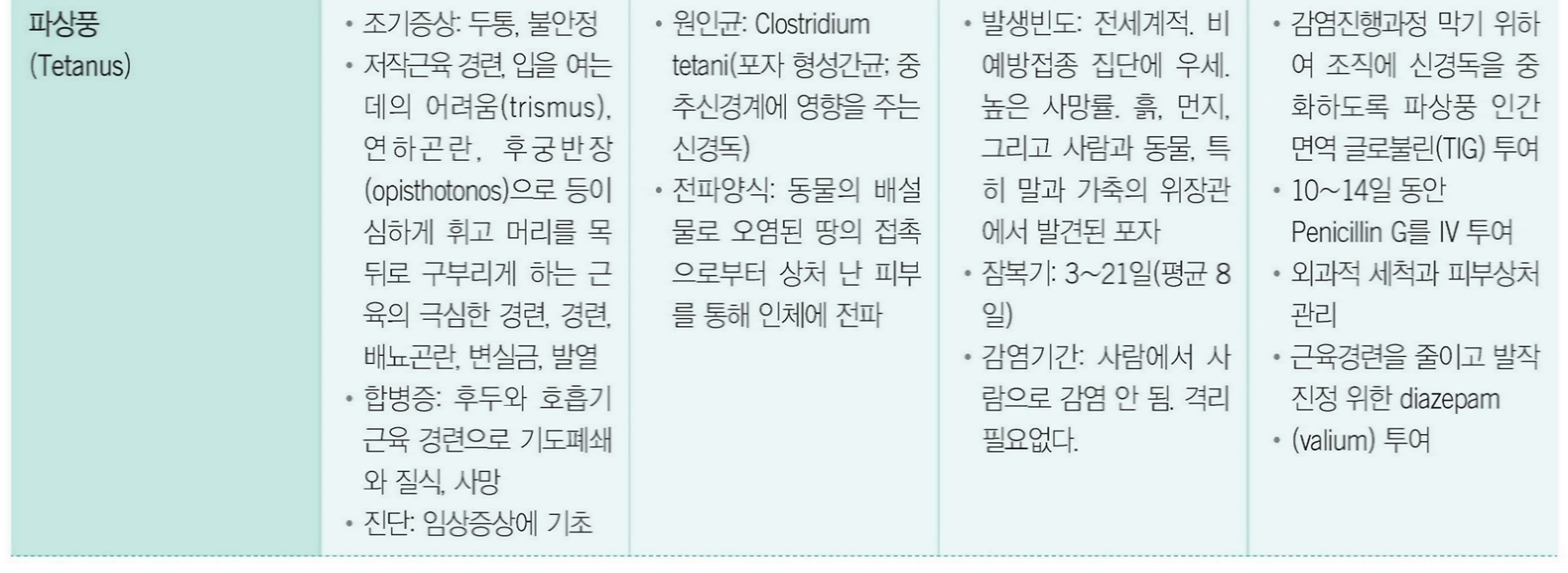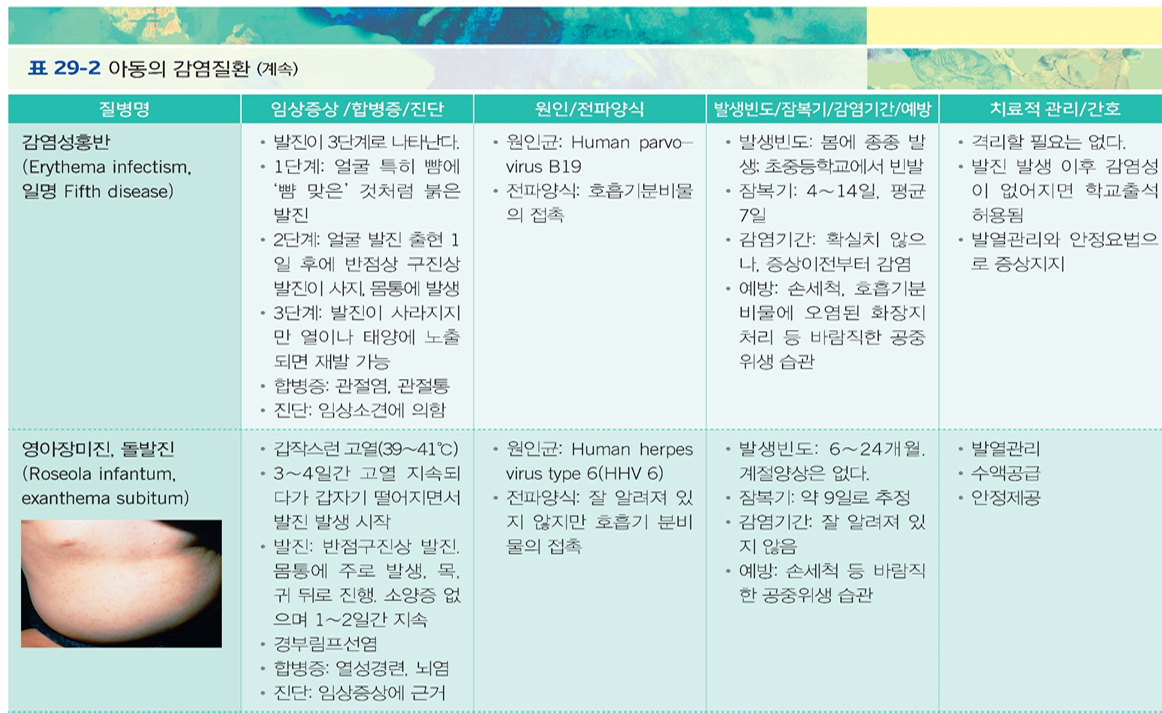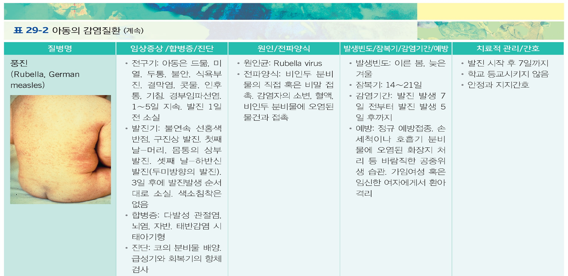 | 풍진 | 바이러스 | 미열, 발진, 림프절 비대 | 임신부 감염 시 위험 |