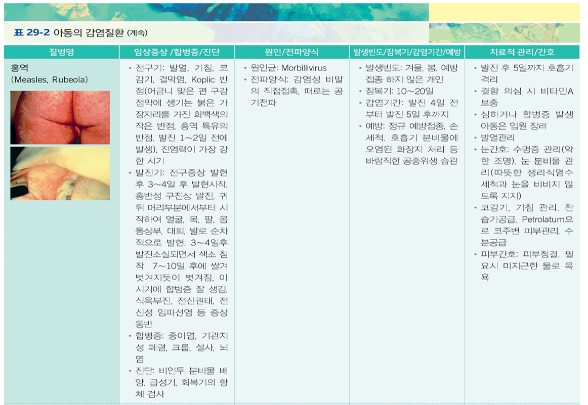 | 홍역 | 바이러스 | 고열, 기침, 발진 | 코플릭 반점이 특징 |