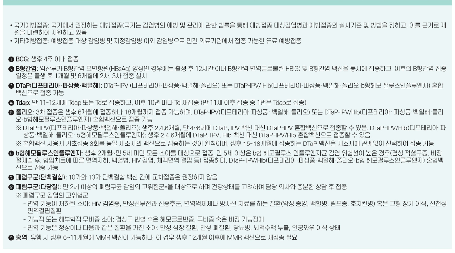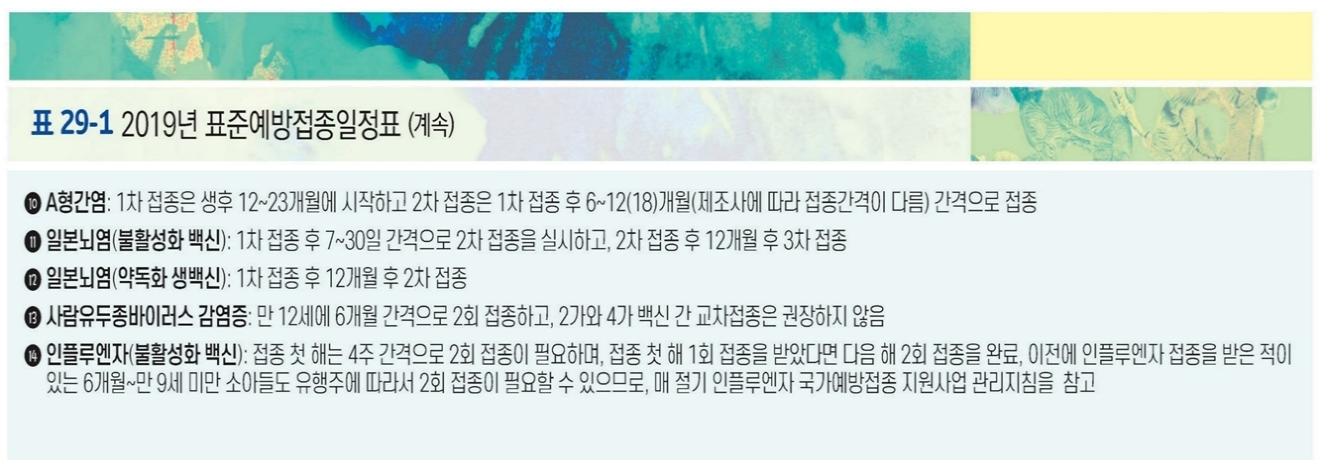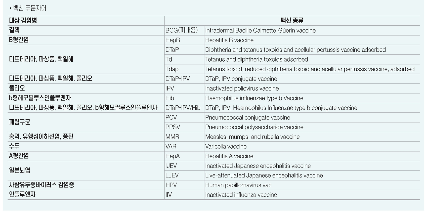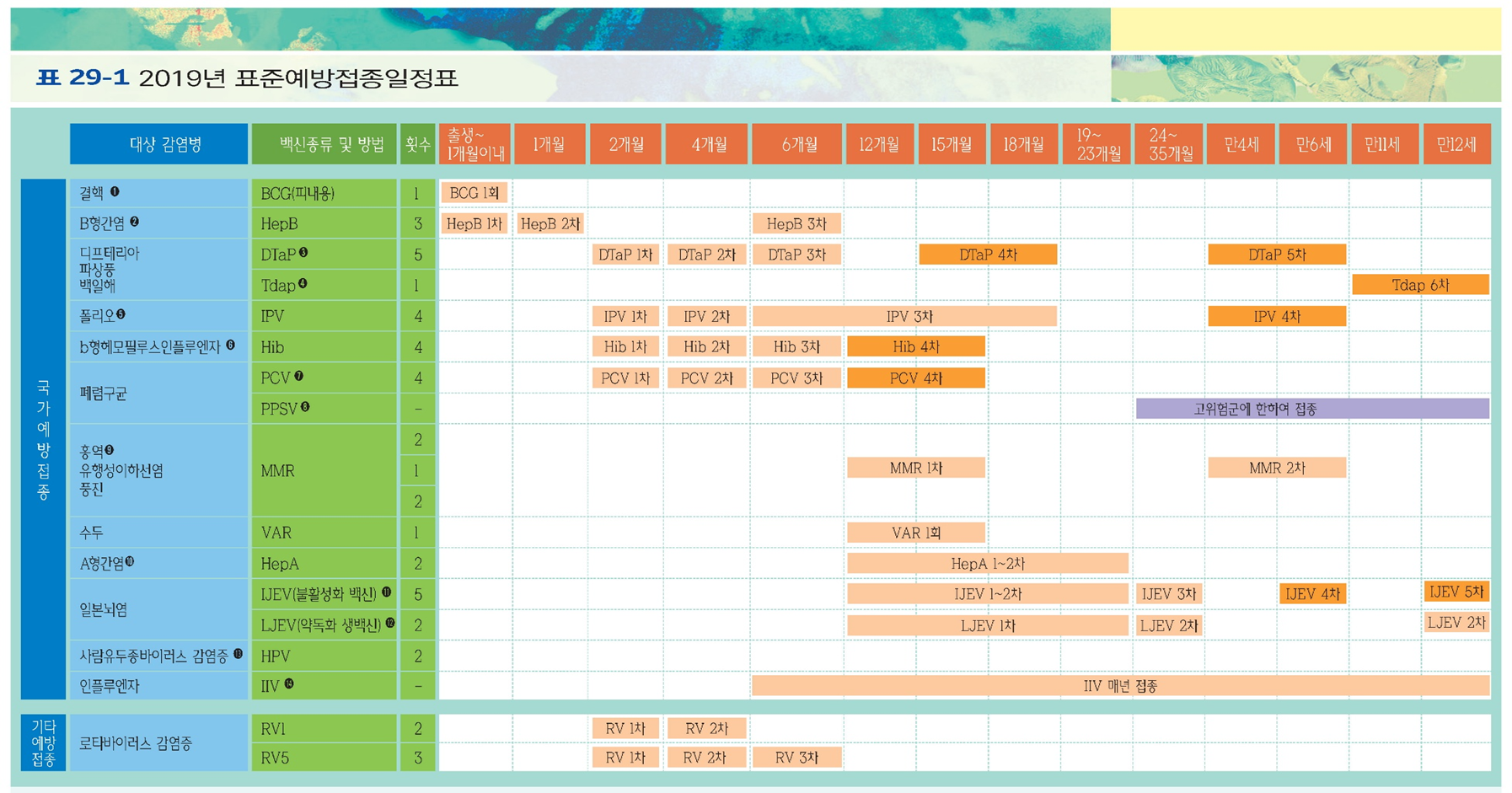 – 종류 : 미세포 백일해(DTaP), 홍역,볼거리, 풍진(MMR), 비활성화된 폴리오 백신(IPV)