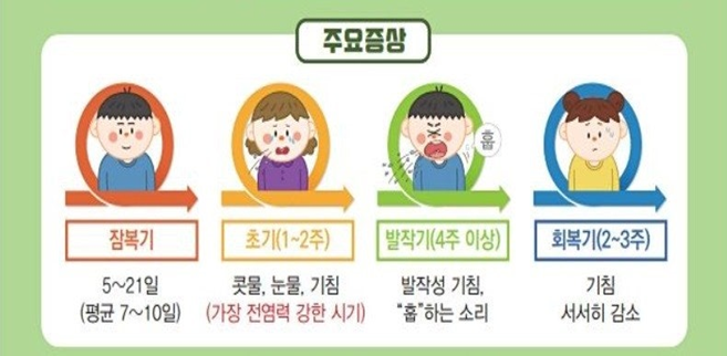 – 발작기(4~6주) : 기침 발작, 짥고 마른기침, 흡기 맒에 ‘흡‘ 하는 소리가 남, 다량의 점액성 가래, 발작 후 구토가 자주 발생함, 4~6주 지속 후 회복기가 됨