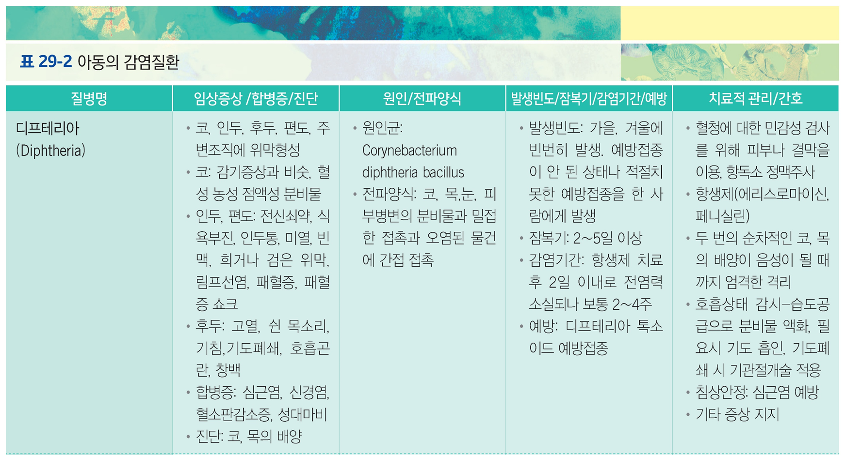 | 디프테리아 | 세균 | 인후통, 막 형성 | 기도 폐쇄 위험 |
