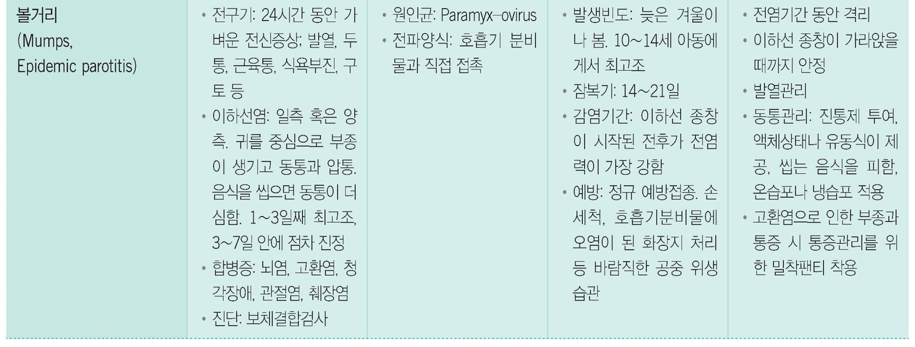 | 유행성이하선염 | 바이러스 | 귀 밑 부종, 발열 | 침샘 부종 특징 |
