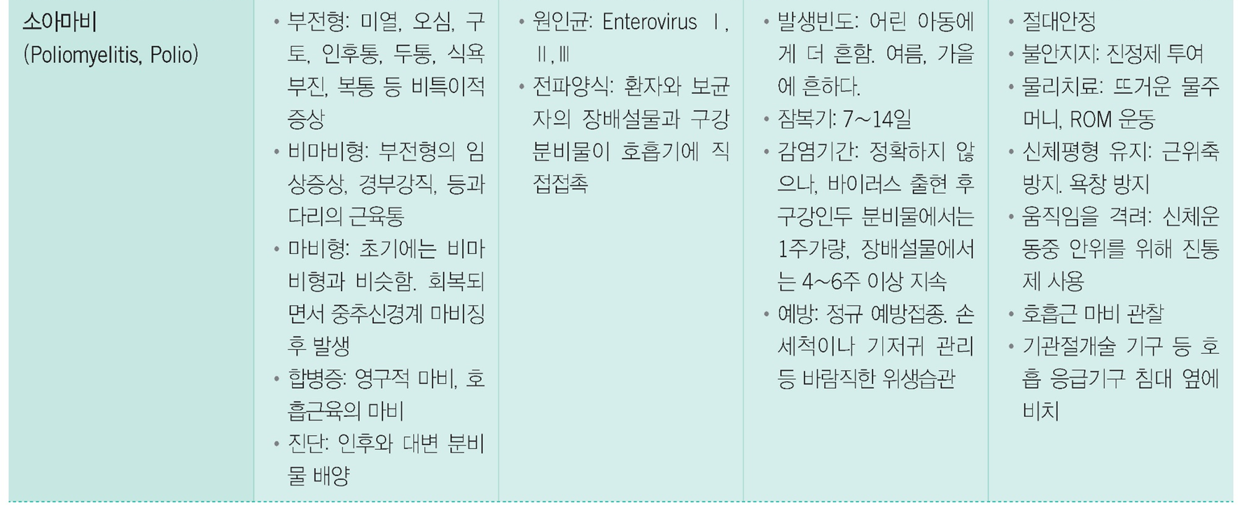 | 소아마비 | 바이러스 | 근육 마비 | 예방접종 중요 |