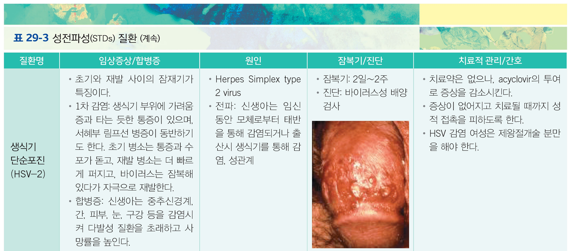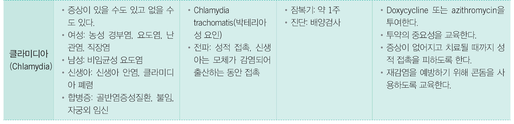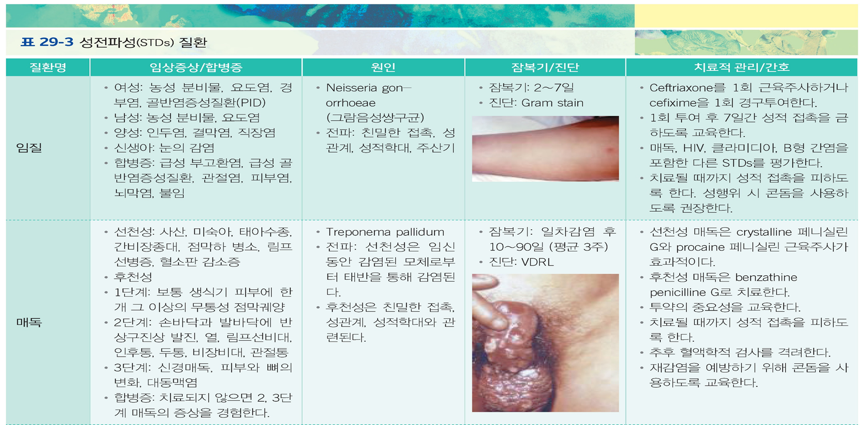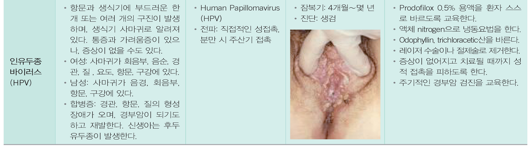 | 성매개감염 | 클라미디아감염, 단순포진바이러스, 인유두종바이러스, 세균질증, 트리코모나스, 매독 |