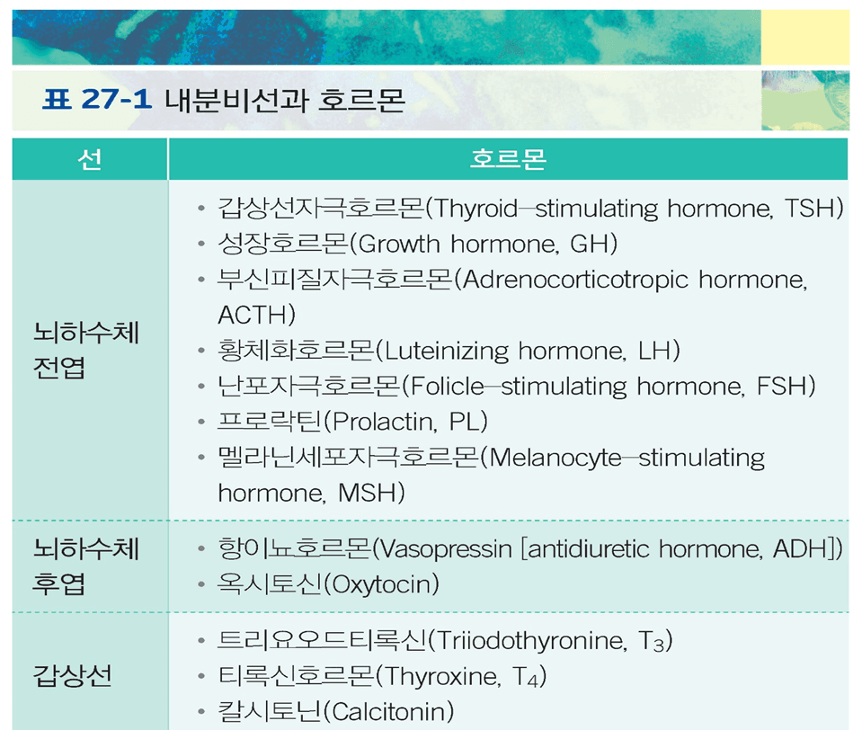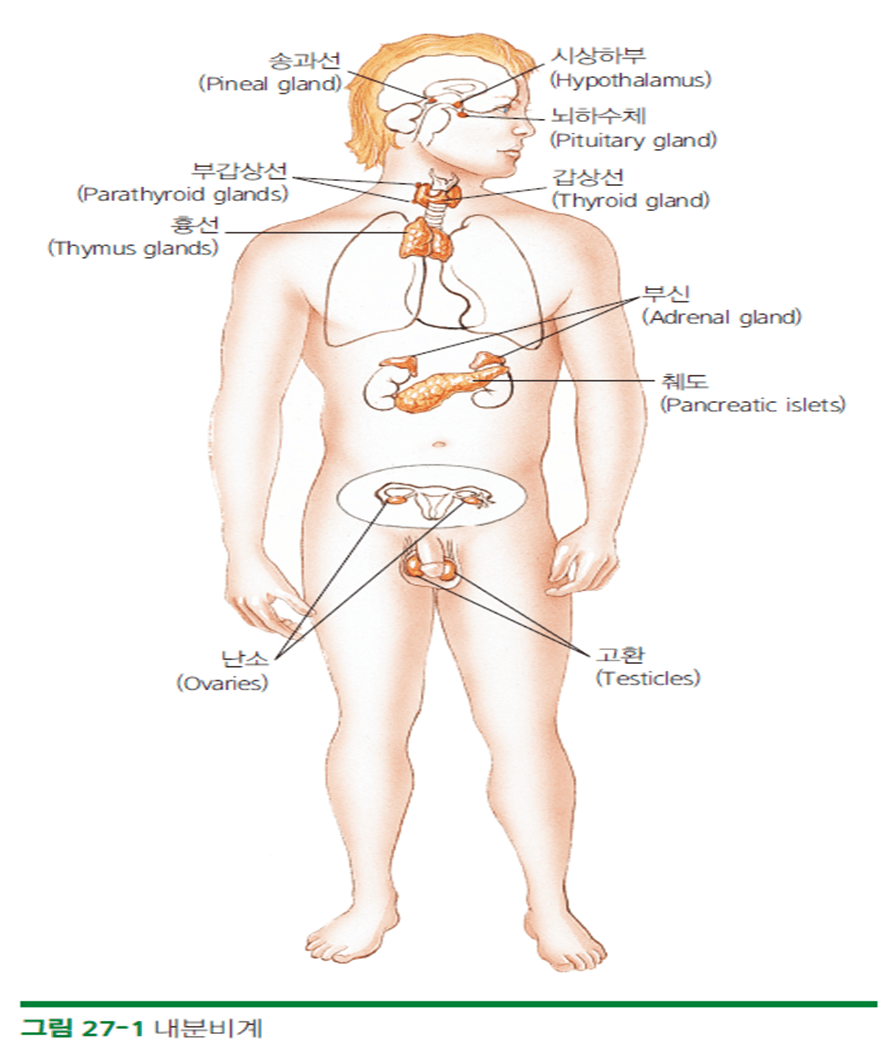 – 인체 내 여러 조직과 기관에 영향을 주는 ‘호르몬’이라고 불리는 화학적 물질을 생산하고 분비하는 선으로 구성되어 있음