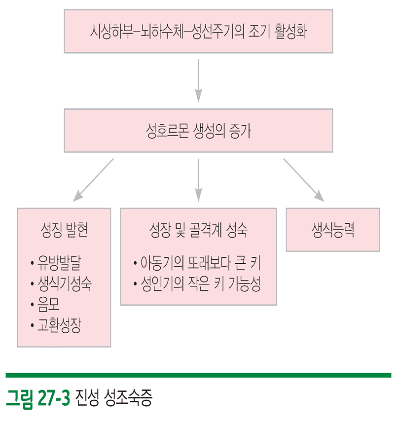 남아 : 9세 이전에 고환의 크기가 커지는 것(2.5cm 이상 또는 고환용적 측정기로 4mL)