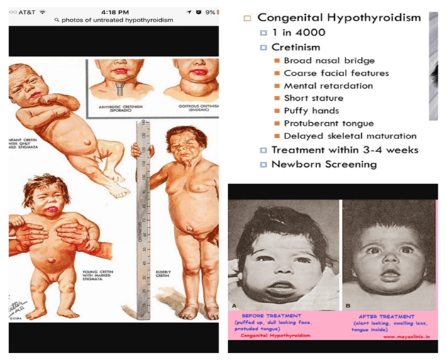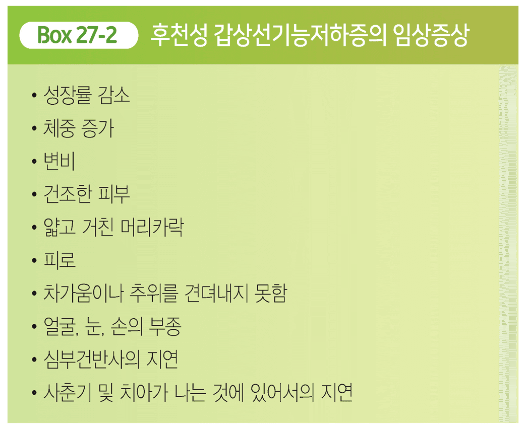 임상증상 : 선천성 갑상선기능저하증에 이환된 영아는 출생 당시에는 대부분 무증상, 넓은 대천문, 제대 탈장, 변비, 황달이 오래 지속, 치료하지 않으면 신경계 발달 지연으로 지능저하나 정신지체까지 유발할 수 있음 (추가, 기 16)