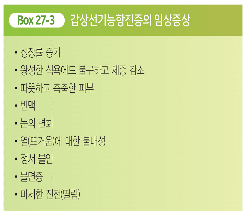증상 : 불안정, 빈맥, 고혈압, 식욕증가, 체중감소, 안면홍조, 돌출된 눈, 갑생샘 비대 등 (추가)