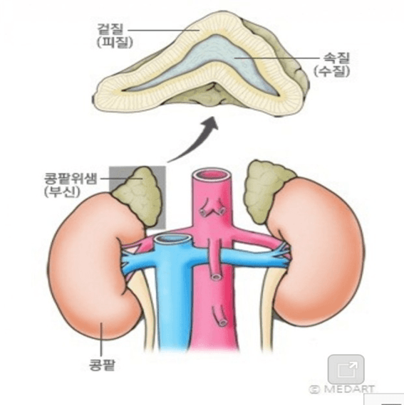 – 부신(adrenal gland) : 내측의 피질(cortex)과 외측의 수질(medulla)로 구성
