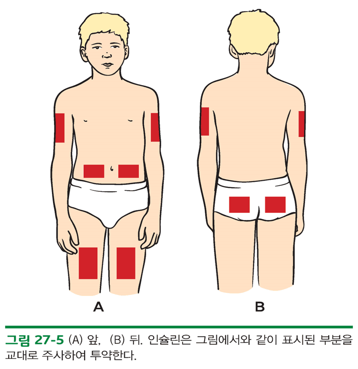 – 주사 부위와 주사 방법에 대해 교육, 주사부위는 상박, 복부, 대퇴, 둔부