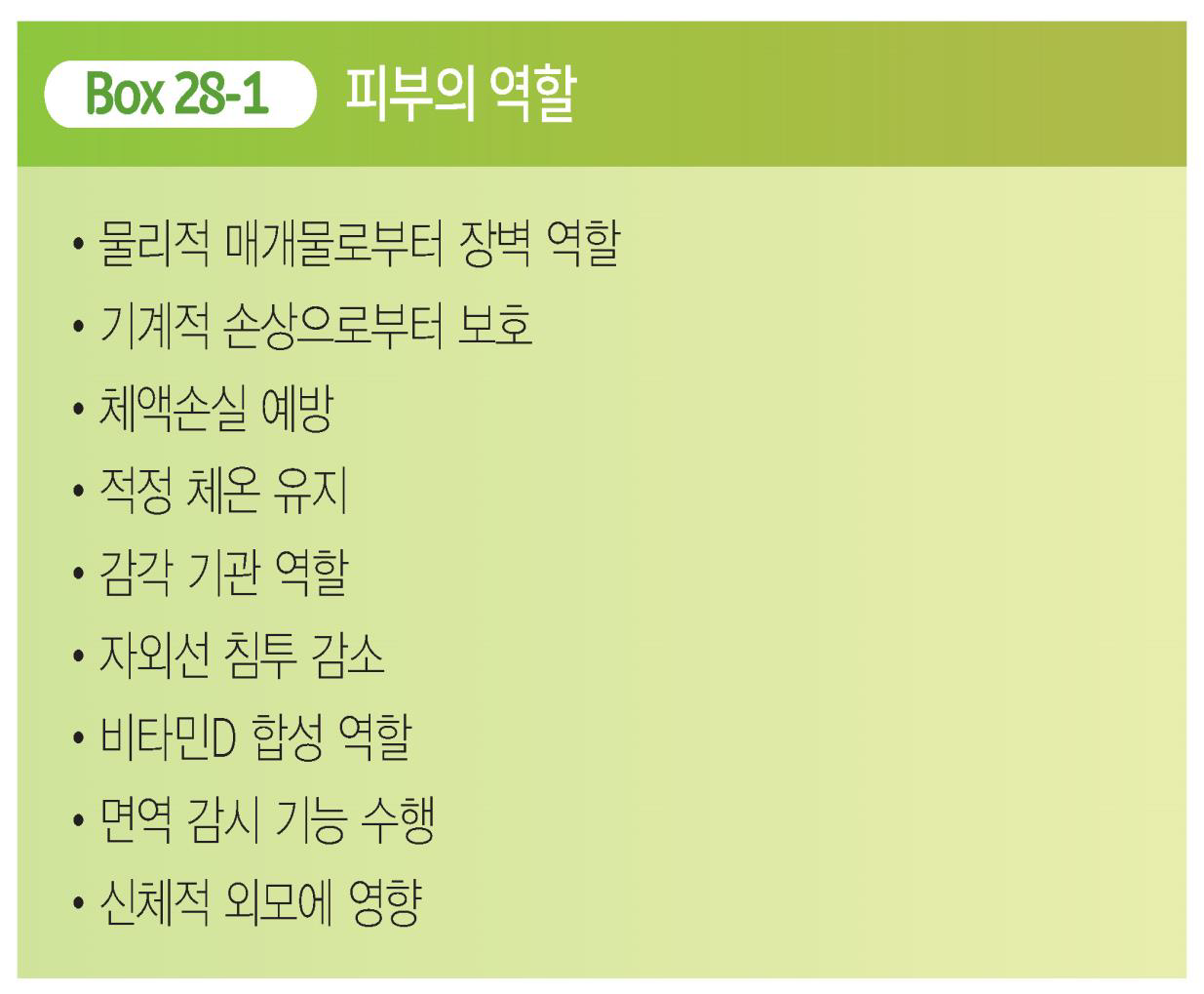 – 감염성 물질이나 외부 환경 및 화학적 손상에 대한 방어막이 됨