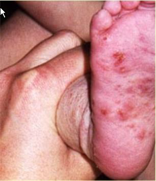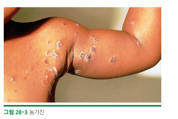 – 수포성 농가진(사지 호발) : 작은 붉은 반점 빠른 속도로 수포 형성 수포 크기 증가 수포가 터져 피부에 미란을 유발 혹은 벌꿀색 가피 형성