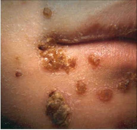 – 구강 주위 병변이 흔함