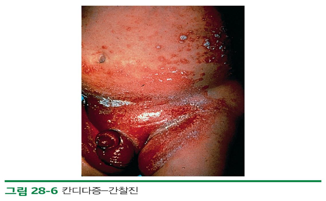 – 칸디다성 기저귀 피부염 : 항문 주위에서 시작해서 회음부 전체로 퍼지는 홍반성 반점의 급성발병이 특징