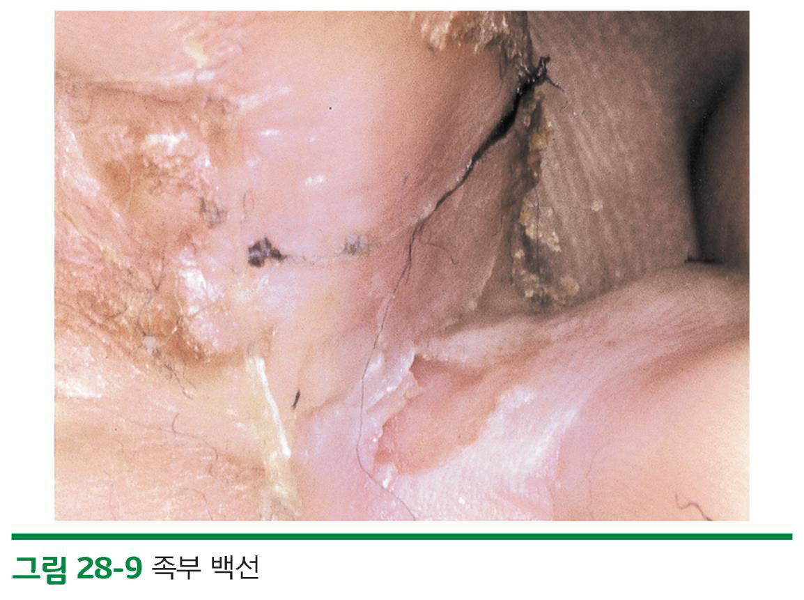 – 말초의 피부가 접히는 부위인 손목, 액와, 사타구니, 발, 발목 등에서 발생