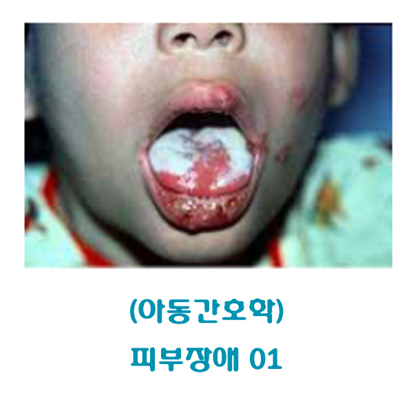 – 아구창 : 구강점막과 혀의 양측 가장자리의 크림 같은 백색반점(plague)이 특징