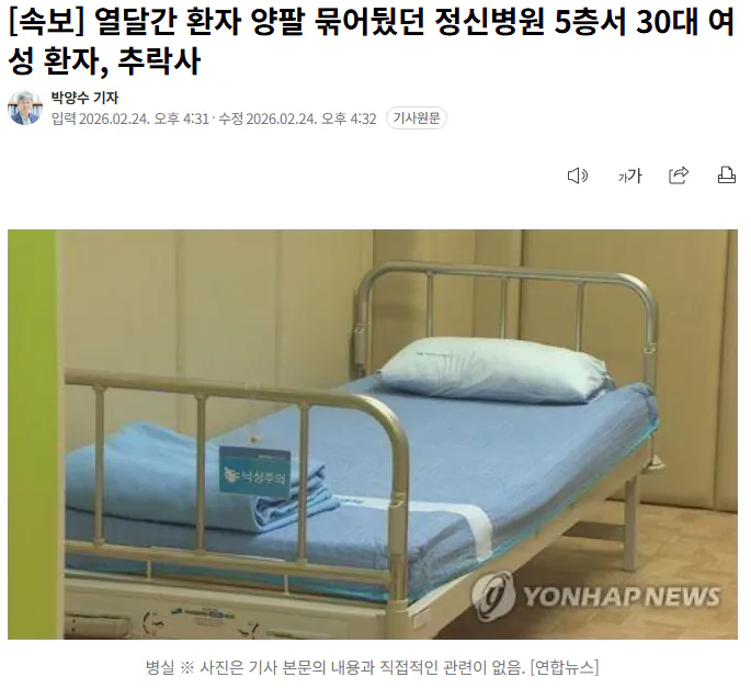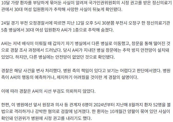 - 열달간 환자 양팔 묶어뒀던 정신병원 5층서 30대 여성 환자 추락사