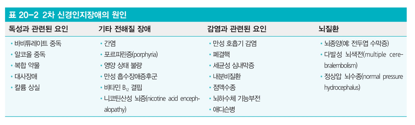 – 이차 신경인지장애 : HIV나 뇌손상과 같이 다른 질병으로 인해 나타나는 경우