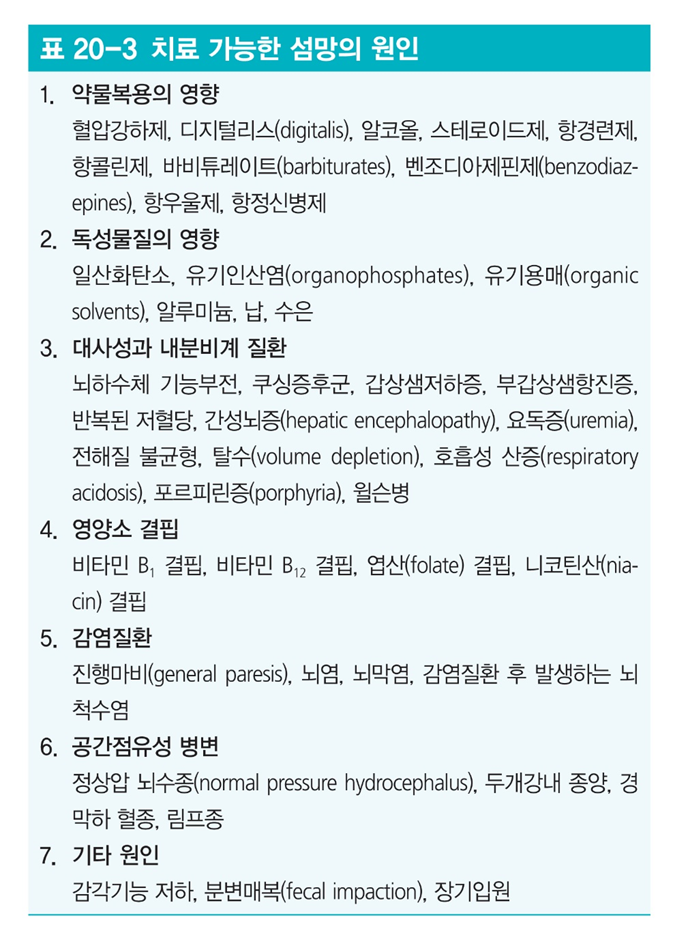 – 섬망, 신경인지장애의 퇴행적 측면을 다루는 데 있어 간호활동의 성공 여부는 문제를 중지시키거나 치료하는 것이 아니라 질병으로 인한 퇴행 속도를 얼마나 늦출 수 있느냐가 평가의 관점이 됨