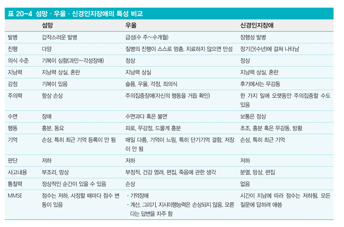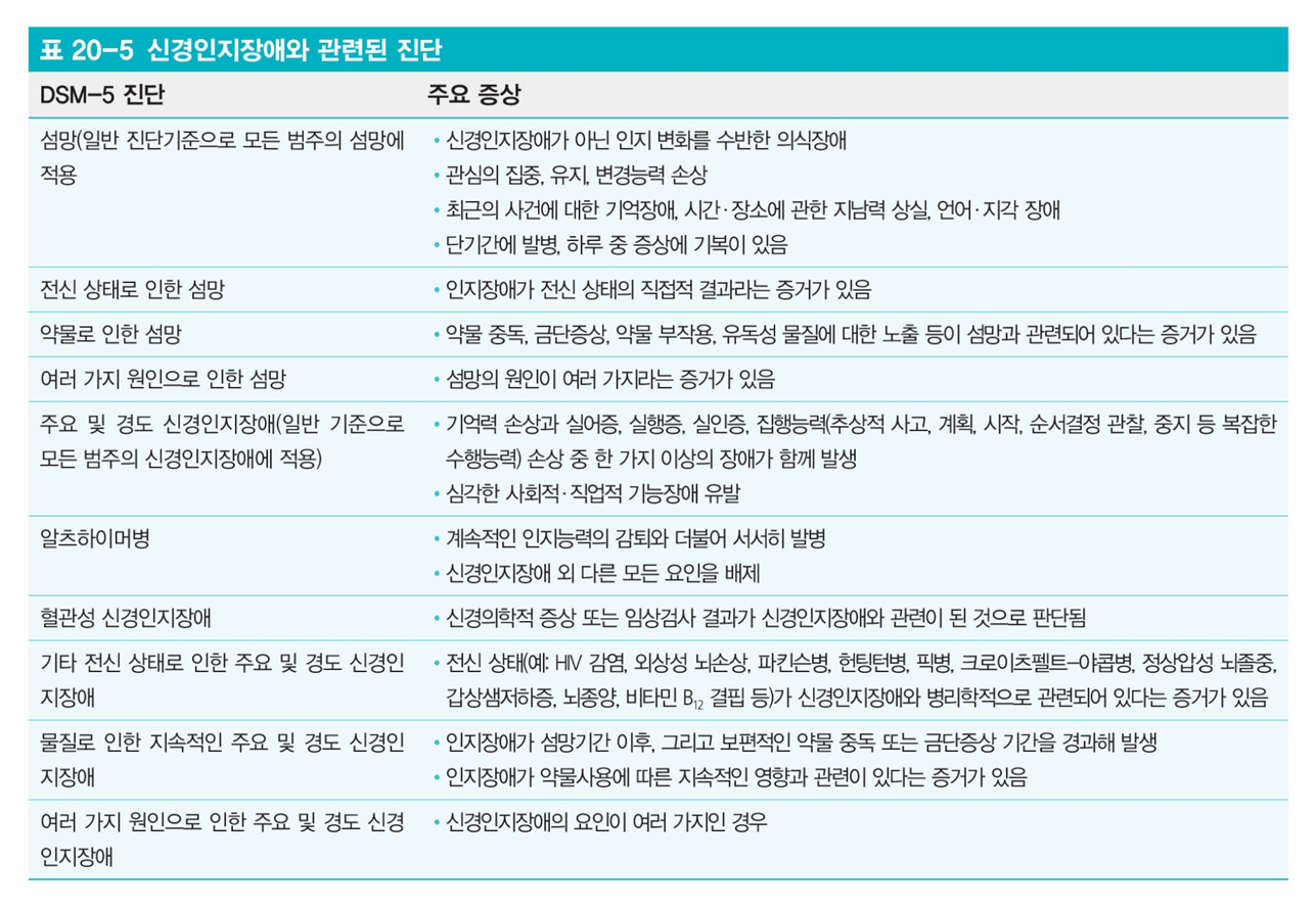 – 신경인지장애는 지적 능력이 상실되면서 사회적 · 직업적 활동이 불가능해지고 기억력, 판단력 그리고 추상적 사고능력에 손상을 보이지만, 의식이 흐려지는 증상은 보이지 않음