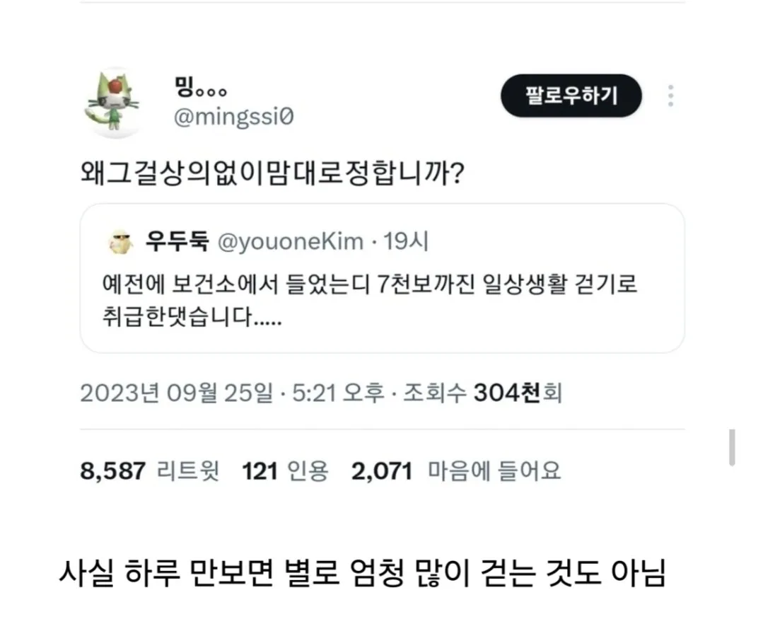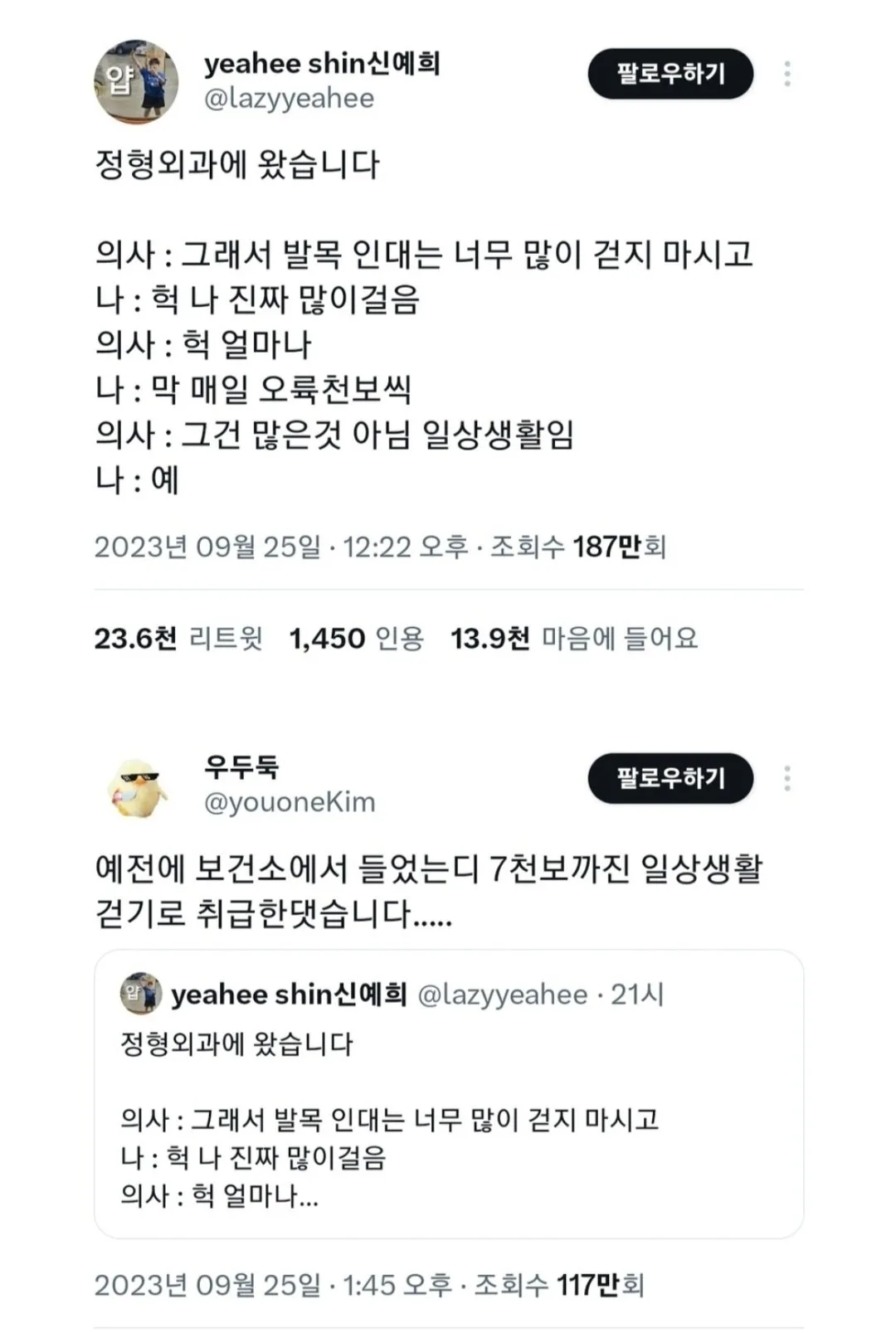 정형외과 : 많이 걷지 마세요 차례 숨기기 정형외과 : 많이 걷지 마세요 관련 보통 대중교통 출퇴근하고 회사에서 밥먹으러 돌아다니고 하면 육칠천보씩 찍힐거임족저근막염 내버려두면 발바닥에 뿔도 생김이분척추(Spina Bifida) – 선천성 희귀난치질환(여성건강간호학) 난산 04(여성건강간호학) 난산 03(여성건강간호학) 난산 02(여성건강간호학) 난산 01 Post Views: 408관련태그:걷기많이 걷지 마세요정형외과 : 많이 걷지 마세요이전중환자실 간호사로 살아가는 썰다음희귀병을 앓고 있다는 사실을 고백한 이홍기 (화농성 한선염)
